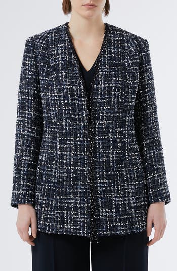 The interplay between sparkling rhinestones and swingy fringe transports a classic yarn-dyed tweed jacket from a workday look to an after-hours standout.