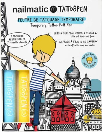 Discover our creative Tattoopen and make-up sets for children, featuring themed kits like ‘Paris’ (yellow & blue), ‘New York’ (green & pink), ‘You’re the Artist’ (red, yellow & orange with a 24-page activity book), and the adorable ‘Rabbit’ and ‘Cat’ sets by Ami Imaginaire—each including temporary felt pens and reusable stencils for endless artistic fun!