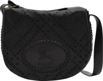 Introduced on the Burberry Spring 2026 runway, the Tavistock crossbody bag is made in Italy from leather, treated for a soft finish and glossy sheen. The saddle silhouette is crafted with a perforated check, intricate whipstitching at the side panels and a braided trim surrounding the Knight stamp – an archival motif first seen on Burberry bags in the 1980s. Three interior compartments allow for easy organisation. Wear on the shoulder or crossbody with the adjustable strap.||Adjustable strap|Zip closure|Three interior compartments|Hand-painted edges|Appliquéd Equestrian Knight Design at front|Suede lining|Comes with a dust bag