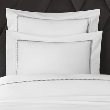 - The white fabric is decorated with elegant silver-gray embroidery, which forms an openwork border of small rhombuses