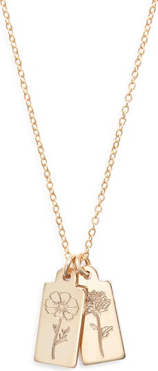 Flowers are carved into each tag pendant on this sweet necklace crafted from 14-karat gold fill.
