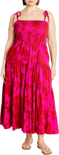 A smocked bodice and a flouncy tiered skirt sweeten the silhouette of this maxi suspended by dainty tie straps.