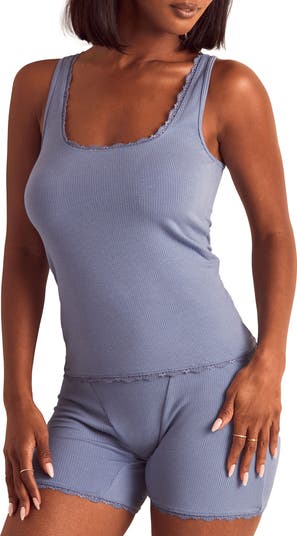 This sleepwear set is comfortable and romantic. It's made of ribbed knit and lace trim and features a scoop neck tank and boxer shorts. It's perfect for lounging, or even under a dress or skirt.