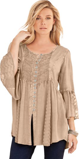 Part of our stunning Big Shirt collection, this style is designed with delicate embroidery along the front and back, and constructed with pretty princess seams. Finished with a special dye to give it an acid-washed look. Faux button-down front. A-line silhouette.