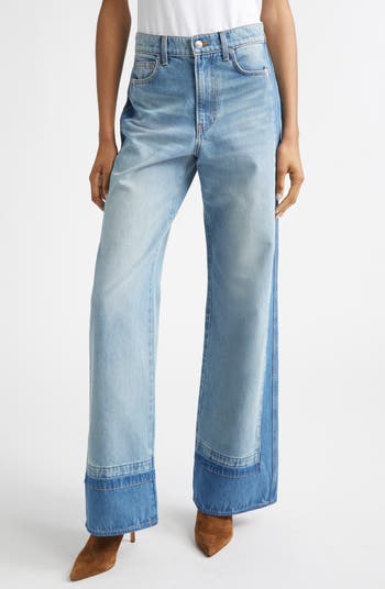 Contrast panels create a cool, colorblocked look on these high-rise, full-length wide-leg jeans made from nonstretch Japanese denim in Los Angeles.
