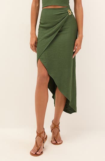 Gleaming hardware shines at the hip of a slinky asymmetric midi skirt ready for a poolside getaway.