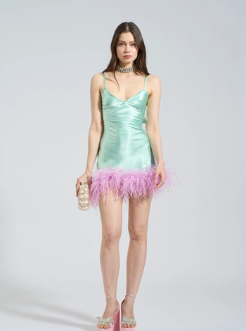 The Taylor - Mint Feather-Trimmed Silk Mini Dress Effortlessly enchanting, unapologetically chic. Slip into luxury with this sleek satin mini in a fresh mint hue—cut on the bias for a flattering, body-skimming silhouette. The pièce de résistance? A lavish trim of blush pink ostrich feathers that adds just the right amount of playful drama. Designed for the woman who commands the room without raising her voice. ✨ Highest quality comfort ✨ Adjustable straps for a tailored fit ✨ Feather trim for a refined yet whimsical edge Pair with sculptural heels, a pearl clutch, and a crystal choker for an evening look that whispers glamour and speaks volumes. For soirées, gallery openings, rooftop cocktails—or any moment worth remembering.