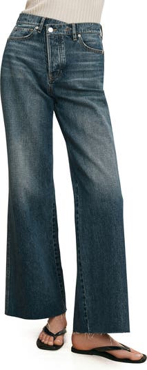 A crossover waist creates a DIY vintage look in easy-fitting jeans cut from silk-kissed denim in a cropped, wide-leg silhouette.