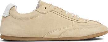Clean monochrome panels and subtle stitching distinguish this soft suede sneaker done in a sleek, low profile and outfitted with two sets of laces.