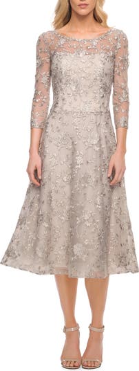 Lace tea length dress with full skirt and sheer top. Lace illusion three-quarter sleeves. Back zipper closure.