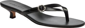 Tea rose hardware adds signature flourish to this kitten heel flip-flop topped with slender leather straps.