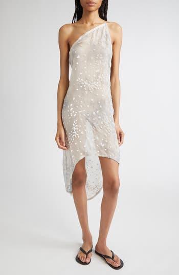 Paloma Wool embraces the barely there look this season with pieces like this runway-featured asymmetric dress in a sheer silk blend dotted with burnout-effect velvet. It delicately drapes off the body with a fluidity enhanced by thread-like straps.