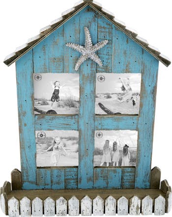 - Featuring a beach house silhouette with a teal finish, this frame showcases a starfish accent and rustic detailing. The coastal-inspired design adds character and creates a relaxed, seaside look that complements nautical and casual décor styles.