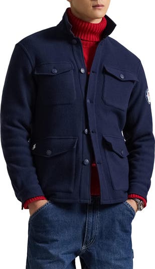 A team USA logo at the sleeve brings heritage-driven, championship energy to this button-front shirt jacket designed in a warm wool blend. Roomy patch pockets add functional storage without disrupting the clean silhouette.