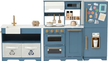 Little chefs can whip up dishes of all sorts with this three-unit wood kitchen playset that includes 17 accessories. Realistic details like a built-in ice maker and clickable knobs heighten the culinary experience, while mood fridge magnets help kiddos tap into their emotions for the day.