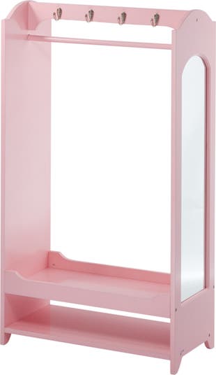 This toy clothing rack with white polka dots is a fun and functional addition to your child's bedroom or play area. It has a hanging area, seven storage hooks for accessories and two lower shelves for shoes and toys to keep your little one organized.