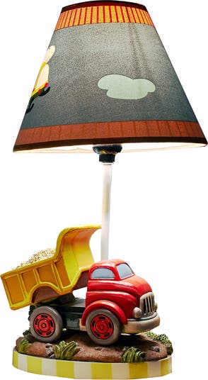 Little ones will be all revved up for bedtime with this colorful truck lamp decorated with a flying helicopter on the shade.