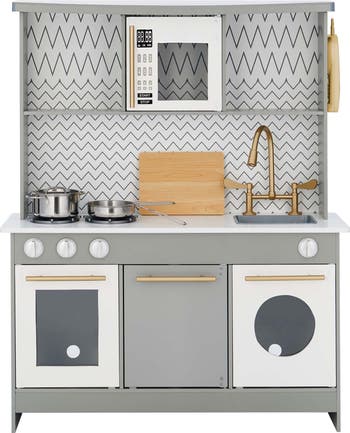 Help your little one imagine making gourmet meals of their own with this modern kitchen playset. The interactive design includes opening oven and microwave doors, turning oven knobs, burners, drawers and an under-sink cabinet to make playtime more realistic. With accessories, including a cordless phone, spatula, pot, pan, lid and chopping board, this toddler kitchen sparks your little chef's imagination.