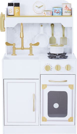 This glam kitchen has a functional and interactive design featuring a deep farmhouse-style sink, oven and two stove burners. There are also hooks for hanging utensils, a top shelf and underneath cabinet for storing pretend food and cookware.