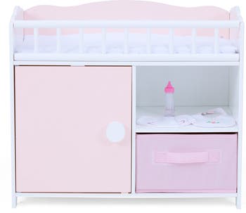 From a changing table that doubles as a bed to the plenty of comparents, this doll set has it all. The included bib is decorated with embroidered roses and matches the accompanying accessories and pink plaid panels.