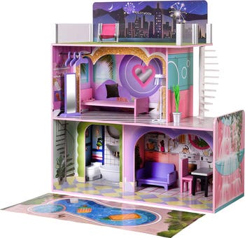 Kids will love making their toys feel at home in this modern dollhouse made with a three levels, a light-up floor lamp and sticker sheets for fun decorating.