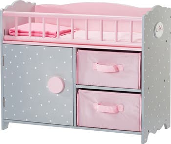 This polka-dot crib with spacious storage underneath has soft, pink bedding that keeps your little one's baby doll cozy and comfortable through the night.