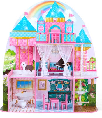 Fields of wildflowers, woodland creatures and a rainbow set the stage for this beautiful countryside castle that's ready for your little one's imagination. The pink castle features aqua-colored towers, rooftop terrace, balconies and a garden area with a swinging bench.