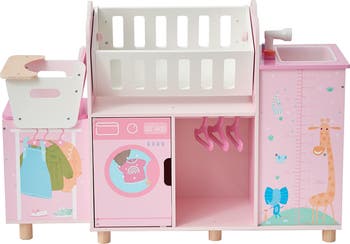 Includes: Rocking cradle, detachable high chair, washing machine, sink with play showerhead, closet space, growth chart, closet storage and three doll clothing hangers