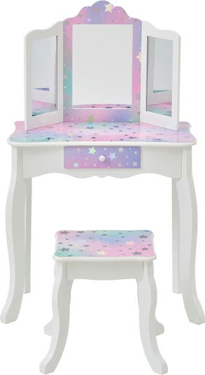 Add functional and elegant decor to your little one's bedroom with this decorative vanity set. It includes a three-mirror setup with a stool to make getting ready convenient and fun. A built-in drawer provides plenty of storage for makeup, brushes and toys.