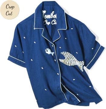 Assemble, fishies!! We're stronger together!! This is the inaugural product in our 'By Hand' collection. Each product is hand-sewn in India and incorporates novel finishings, fabrics and/or dyes not available on our standard production line. This shirt is our crop cut fit designed for women in particular: still a boxy unisex camp collar style, but with a flattering crop and shorter sleeves than our usual unisex fit.