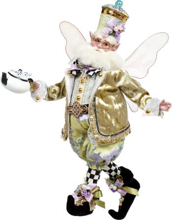 A Mark Roberts–style teapot fairy stands whimsically, dressed in ornate fabrics and delicate trims, exuding charm and elegance. She gracefully holds a teapot in one hand while balancing a decorative tea container atop her head, as if mid-ceremony. The fairy’s playful expression and intricate details make her feel like the enchanting guardian of an afternoon tea ritual.