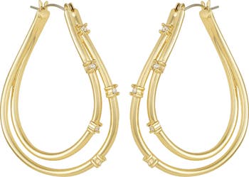 Add a touch of polished elegance to your look with these stunning teardrop hoop earrings. These earrings feature a unique layered design, creating a rich and dimensional look. The hoops are delicately accented with sparkling stones for a hint of glamour and shine. With an inner diameter of approximately 1.8" (46mm), these earrings are designed to make a graceful statement. They secure with a comfortable and reliable click-top closure.
