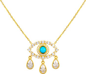 A symbol of protection reimagined with modern elegance, this Evil Eye necklace radiates both meaning and beauty. At its center, a vivid turquoise stone is encircled by a halo of brilliant white crystals, forming the iconic protective eye. Three teardrop-shaped charms dangle gracefully below, catching the light with every movement for an added touch of sparkle. Set in luminous gold with a delicate chain, this necklace is perfect for layering or wearing solo as a statement of style and strength.