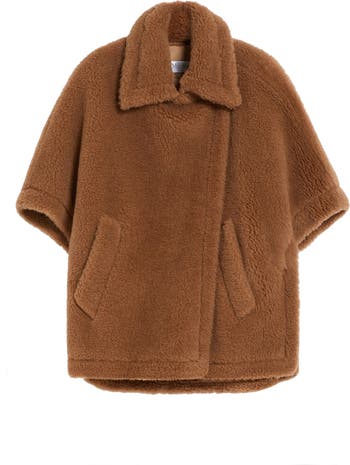 The brand's teddy bear fabrication—a blend of camel hair and silk—creates an enviably plush look and feel for this boxy cloak with shortened sleeves.