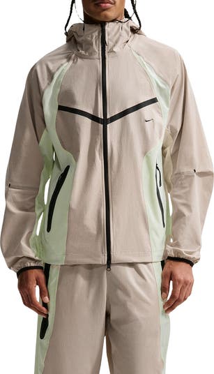 A fusion of techy aesthetics and heritage details brings big Nike energy to a fan-favorite jacket made of lightweight, stretch-enhanced nylon that wicks away sweat for all-activity comfort. Pale colorblocking frames the old-school chevron design, while the high-neck hood and boxy fit keep you on the move rain or shine.
