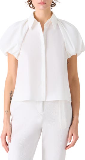 A cotton-dominant technical poplin gracefully takes to both the crisp lines and billowed sleeves on this boxy button-up.
