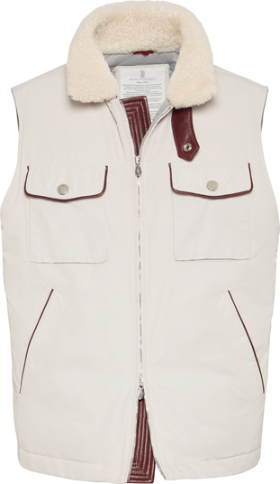 The crafting of the technical thread ensures optimal performance while enhancing the distinctive shimmering texture of the satin, delivered in the season’s colors and enriched with leather details. The high-quality goose down and feather fill is paired with a lightweight nylon lining. All of the padding is sourced exclusively from European suppliers who are members of the EDFA (European Down and Feather Association), ensuring animal and environmental welfare.