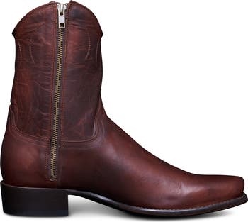 Western stitching and a curved topline bring authentic elements to a burnished leather boot featuring a narrow square toe and fastened by a full-length side zipper. A Goodyear welt, leather sole and stacked leather heel add high-quality durability to this style.