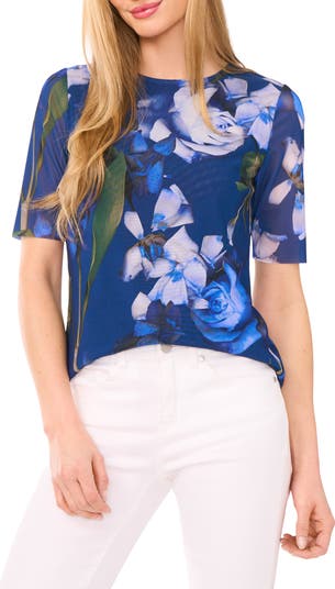 Bold blooms sweeten a frothy mesh top crafted in a fitted silhouette and finished with sleeves that end at the elbow.