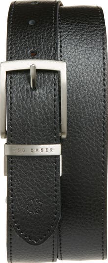 Polished geometric buckle hardware provides a smart finish to a pebbled-leather belt that reverses.