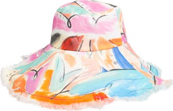 Raw edges and watercolor flowers bring the laid-back vibes in this sun hat made soft and floppy from breathable cotton.