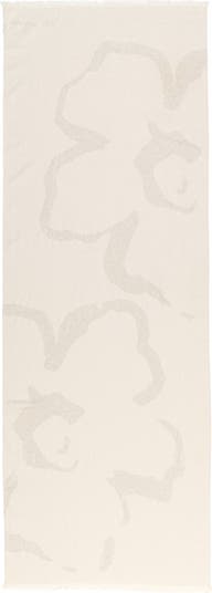 Romantic tonal blooms sweeten this comfy knit scarf finished with feathery fringe.
