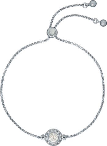 A bezel-set crystal with a dainty halo twinkles along a slender slider bracelet that's perfect to stack or wear solo.