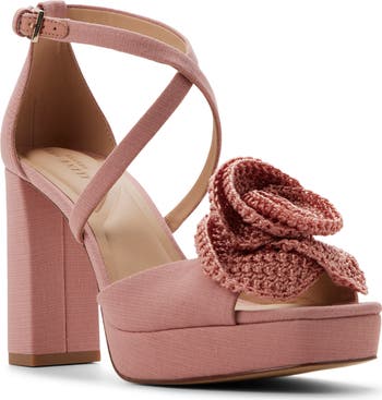 A crochette rosette brings playful whimsy to a lofty sandal set on a chunky platform and soaring block heel.