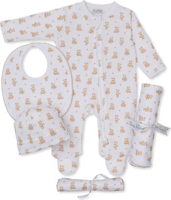 The perfect gift set for the little one in your life includes a footie, hat, bib, burp cloth and blanket—all patterned in darling bears.