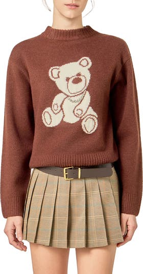 An intarsia teddy wears a necklace of faceted faux diamonds to spring sparkle and a sense of fun to this cuddly crewneck sweater.