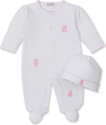 This adorable little footie made from soft, breathable pima cotton channels the cuddly comfort of childhood teddy bears with its colorpop embroidery and matching beanie hat.