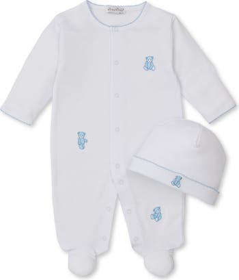 This adorable little footie made from soft, breathable pima cotton channels the cuddly comfort of childhood teddy bears with its colorpop embroidery and matching beanie hat.