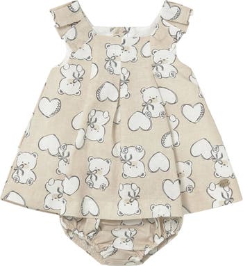 Playful and easygoing, this teddy‑bear print dress brings a sweet touch to everyday wear. The soft fabric and ruffled straps keep little ones comfortable while adding a charming, casual look.