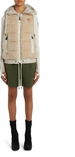 Crafted from warm, tactile teddy fleece, this channel-quilted down vest is designed for après ski fun with a drawstring hood and hem. Contrast trim and a nylon-laqué yoke bring runway-ready style to the mountain-leisure look.